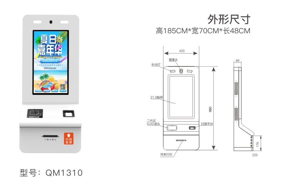 QM1310壁挂式自助充值机/售取票机,可用于不同文旅业态使用,满足游客自助购票、兑换取票及园区二次消费自助充值、查询、退款等操作。箱体采用不锈钢材质,流线型外观设计,兼顾实用与美观; 采用触摸式操作,最快只需点击一次即可完成购票选择; 采用矢量图形技术,界面表现力强; 采用前后开门设计,方便管理和维修; 操作面板拆卸方便,大部分模块可用导轨拖出,维护方便; 各种箱体轻便可靠,配备电子ID和多重保护,兼顾安全性和易用性。