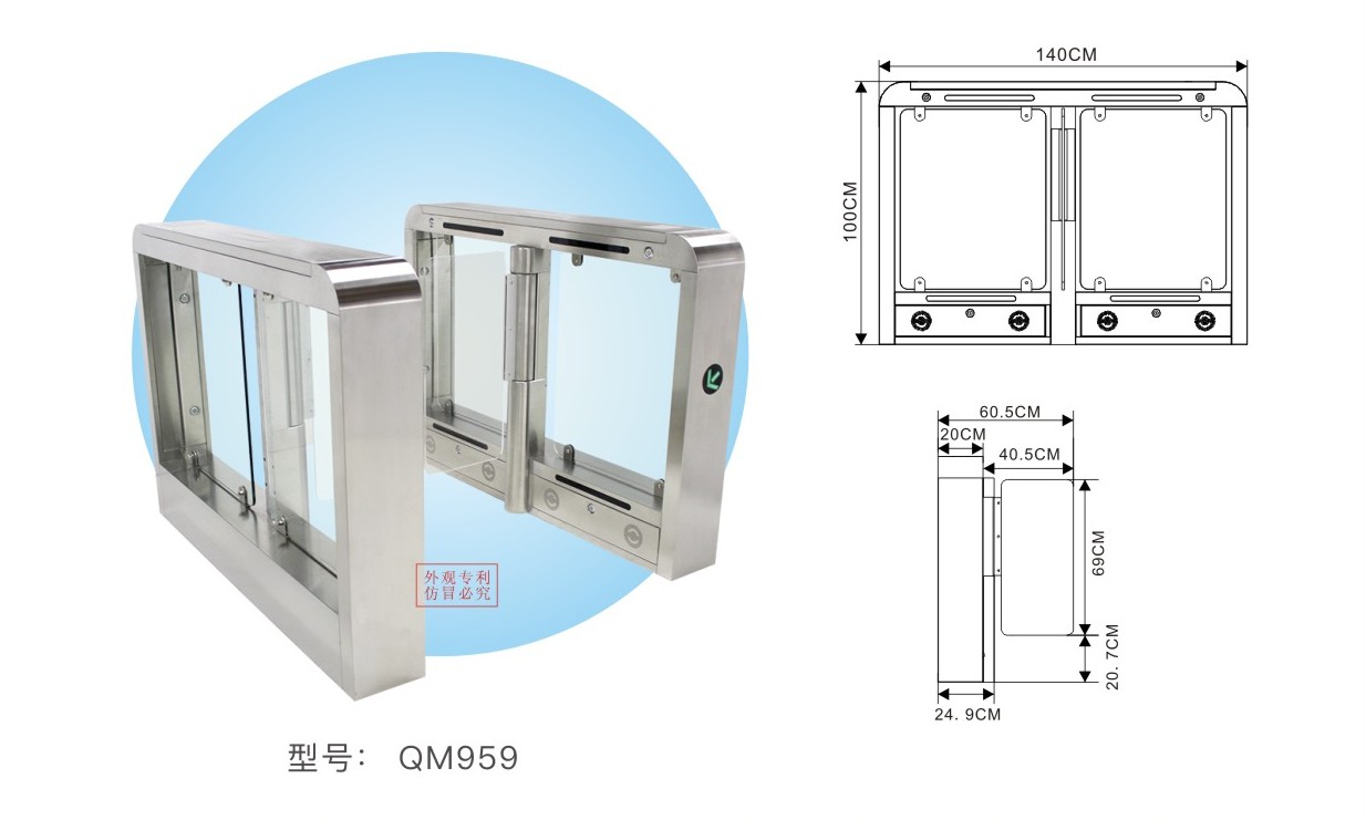 QM959型号三辊闸检票闸机可用于人行通道及自动检票管理,标配二维码识别、IC卡识别,可加配身份证、人脸识别模块,用于景区、陆地乐园、水上乐园、温泉酒店、科技馆、博物馆等。能够实现公共通道,劝阻级访问控制,在断电时闸机闸摆可自动打开,保证通道通畅,满足消防安全等需要。具备多种不同配置,可适用于不同场景,并可解决行人出入口通道所有的控制问题。
